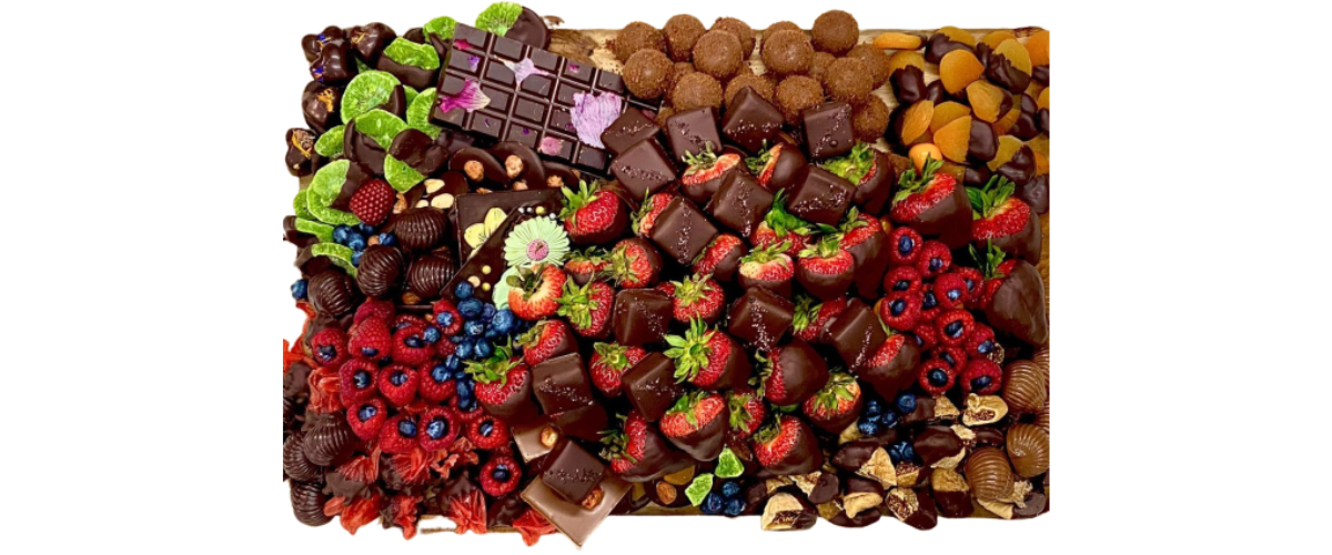 Each stunning SK Chocuterie creation includes an eye-catching display of organic hand painted and hand dipped artisan chocolates, local organic in-season fresh fruit, couverture dipped organic dried fruits, nuts, edible herbs and flowers.