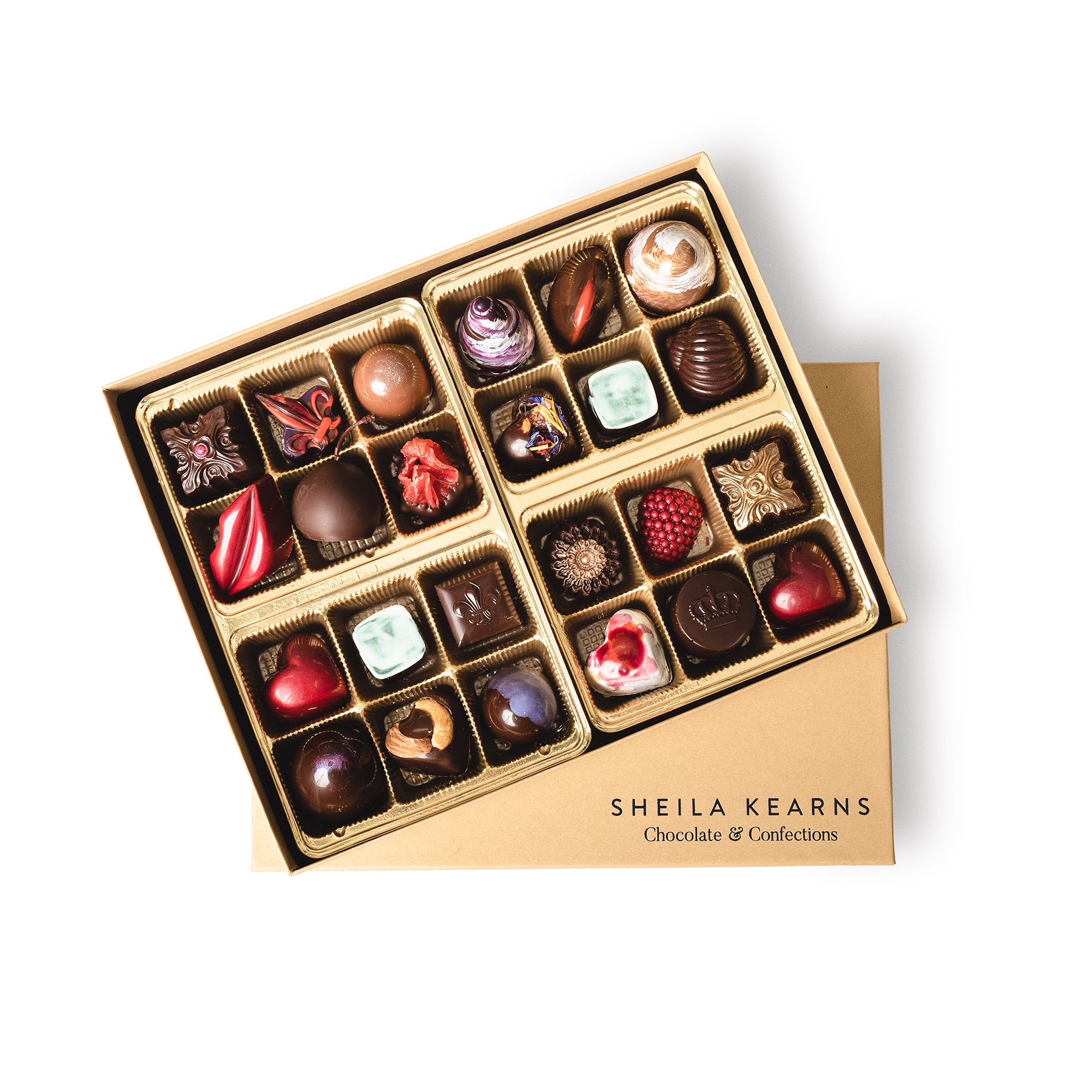 Our large "Chocolatiers Choice" Assorted gift box includes 24 hand-crafted seasonal artisan chocolates. Assorted chocolates change regularly, dependent upon available fresh ingredients.