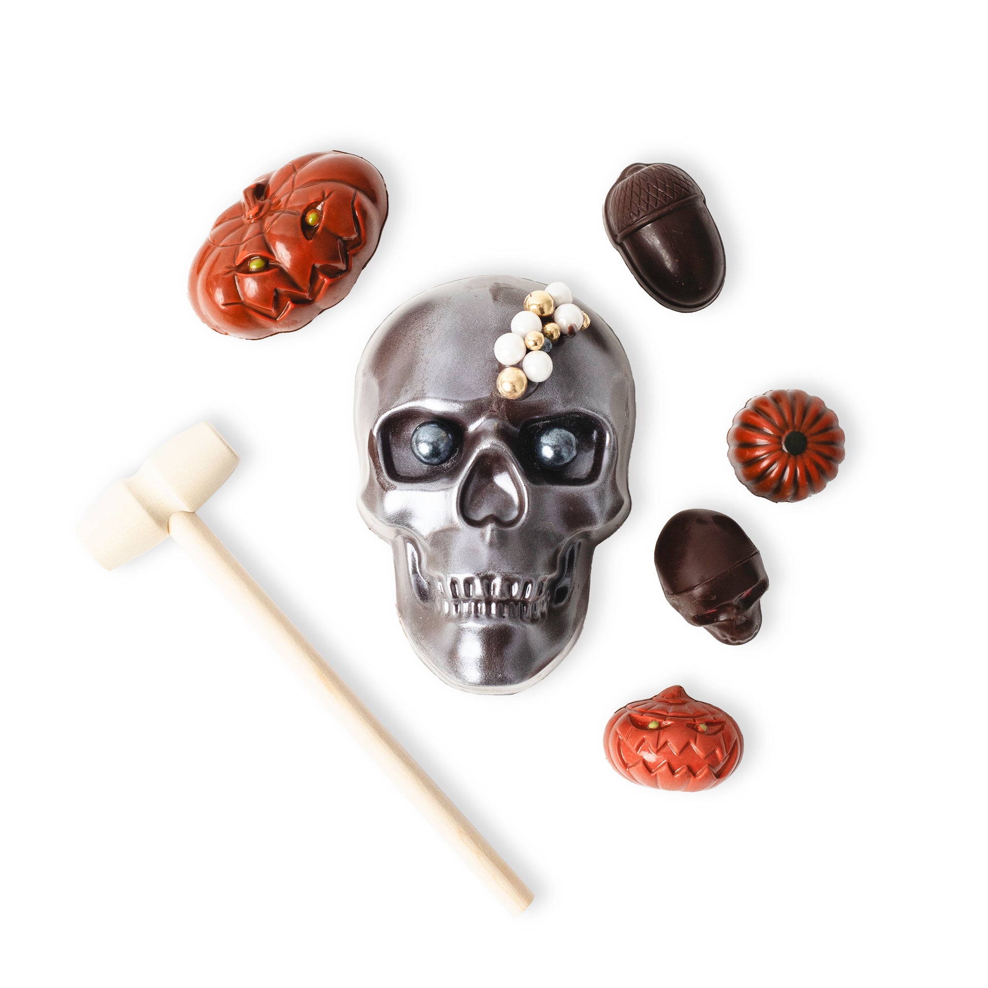 Whimsical Silver Spooky Smash Skull adorned with Edible Pearls and filled luxury Halloween chocolates with seasonal fillings.